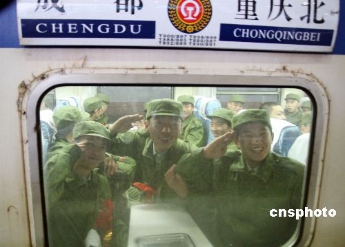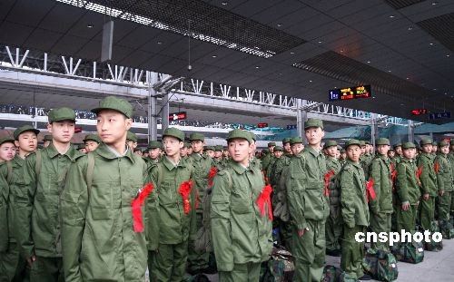 11月19日下午,重慶地區(qū)2008年冬季招兵征召的首批915名進藏新兵在重慶火車北站登上列車,前往成都受訓(xùn)準(zhǔn)備進藏服役。據(jù)稱,本次前往西藏服役的新兵8成以上達到高中以上文化程度,平均年齡為19歲,來自重慶大足、璧山、渝北等17個區(qū)縣。中新社發(fā) 郭晉嘉 攝