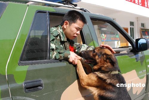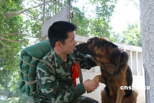 十一月二十四日,武警福建總隊(duì)直屬支隊(duì)的訓(xùn)犬員張世均與息息相處五年的無言戰(zhàn)友“飛虎”依依惜別。又到老兵退伍的日子,在武警福建總隊(duì)服役期滿的三千多名老兵,開始踏上返鄉(xiāng)的路程。中新社發(fā) 曾朝群 攝