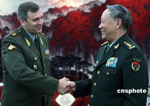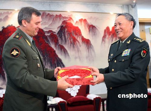 中央軍委委員、中國(guó)人民解放軍總參謀長(zhǎng)陳炳德上將,10月24日下午在北京八一大樓會(huì)見來訪的俄羅斯武裝力量第一副總參謀長(zhǎng)布魯京中將,雙方在友好的氣氛中進(jìn)行了交談。中新社發(fā) 宋吉河 攝