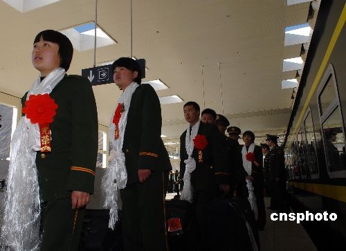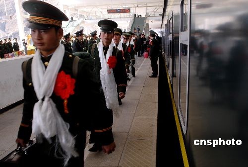 11月25日,駐藏某部及武警西藏森林總隊的退伍老兵們在戰(zhàn)友和拉薩當(dāng)?shù)厝罕姷臍g送下踏上了回家的青鐵列車。從有關(guān)部門獲悉,拉薩火車站已經(jīng)為新老兵準(zhǔn)備了充足的車輛和票額。另據(jù)了解,今年鐵路新老兵運(yùn)輸將繼續(xù)執(zhí)行購票、行李托運(yùn)、進(jìn)出站和中轉(zhuǎn)換乘“四優(yōu)先”原則,為新老兵排憂解難、提供方便,確保新老兵乘車有票、上車有座,退伍老兵在旅客列車上用餐也將享受優(yōu)惠。 中新社發(fā) 龍昊 攝