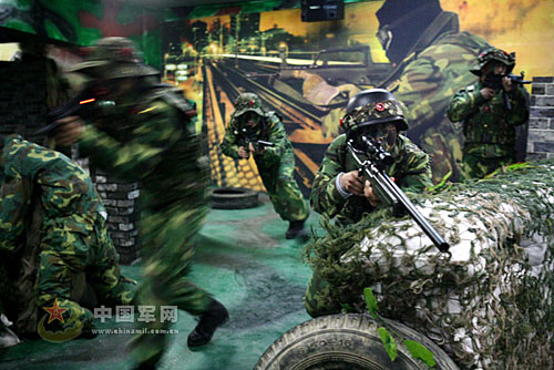 “Go,Go,Go!”12月2日下午, 一場激烈的“戰(zhàn)斗”對決在一塊特殊的陣地上進(jìn)行!皯(zhàn)場”上矮墻林立、沙包堆積、枯樹橫亙,周圍則“炮火”連天,上空“飛機(jī)”盤旋……。戰(zhàn)士們身著作戰(zhàn)服,手持仿真槍,頭戴裝有感應(yīng)器的頭盔,在時明時暗的“夜空”下穿梭,尋找目標(biāo),激烈對抗。這是某炮兵團(tuán)日前建成的真人CS對抗陣地上的精彩一幕。據(jù)前來觀摩的總部領(lǐng)導(dǎo)介紹,實(shí)施真人CS對抗練兵在我軍部隊(duì)還是首家。