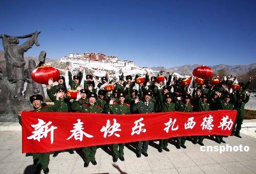 春節(jié)臨近,1月18日,武警西藏總隊(duì)拉薩市支隊(duì)一中隊(duì)官兵手捧哈達(dá)和紅燈籠,向全國(guó)人民祝賀新春快樂:扎西德勒。中新社發(fā) 趙艷志 攝