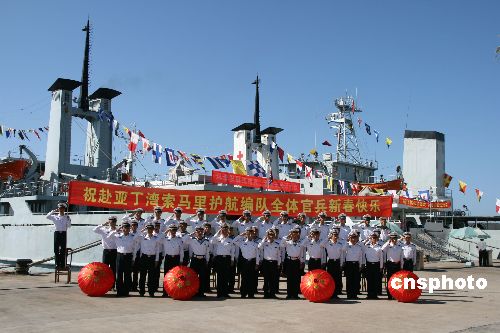 春節(jié)前夕(1月21日),遠(yuǎn)赴亞丁灣執(zhí)行護(hù)航任務(wù)的“微山湖”艦所在的南海艦隊(duì)某勤務(wù)船大隊(duì)官兵,打出橫幅,祝福全體護(hù)航官兵新春快樂(lè),向他們拜早年,并向他們致以崇高的軍禮。中新社發(fā) 劉林 攝