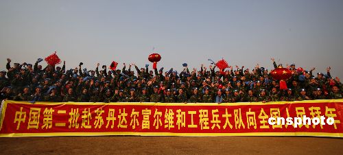 新春佳節(jié)到來(lái)之際,正在蘇丹達(dá)爾富爾執(zhí)行維和任務(wù)的濟(jì)南軍區(qū)某裝甲師官兵向全國(guó)人民拜年。中新社發(fā) 畢華明 攝