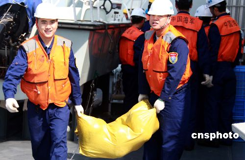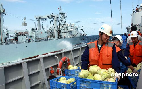 春節(jié)前夕,中國海軍艦艇編隊“海口”號導(dǎo)彈驅(qū)逐艦與“微山湖”號綜合補(bǔ)給艦完成一次海上補(bǔ)給,圖為“海口”艦官兵搬運補(bǔ)給到艦上的“年貨”。中新社發(fā) 孫自法 攝