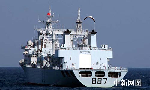 “海口”號導(dǎo)彈驅(qū)逐艦新春與“微山湖”號綜合補給艦在海上進行補給時,一只海鷗從“微山湖”艦上空飛過。中新社記者 孫自法 攝