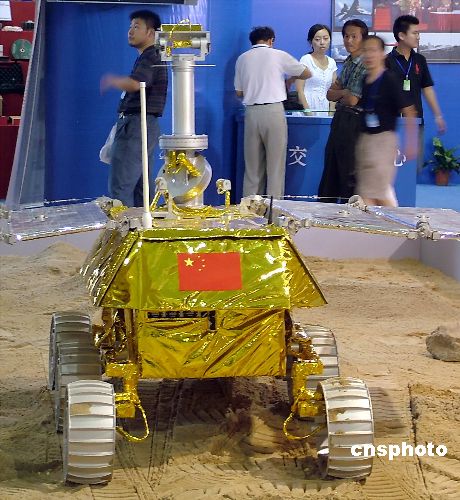 7月9日,腳踩6個輪子,站在“月球”表面,頭頂CCD相機四周轉(zhuǎn)動,巡視到的場景在電腦上即時傳送……在上海航空展中,“月球巡視探測器”表現(xiàn)不凡。據(jù)了解,經(jīng)過層層審批才得以在公眾前亮相的月球車,將于2012年“嫦娥工程”實現(xiàn)“落地”計劃后登陸月球。中新社發(fā) 紹常 攝