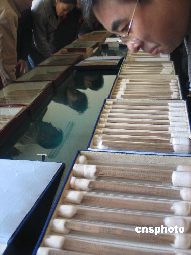 十月十八日,蘭州市民在甘肅簡牘展覽室欣賞兩千年前的漢簡。甘肅簡牘保護(hù)研究中心經(jīng)批準(zhǔn)成立,并于十月十八日揭牌,長期擠放于陰冷庫房里的萬枚珍貴簡牘正式宣告“換新房”。甘肅先后出土簡牘六萬余枚,尤以漢簡數(shù)量最多,現(xiàn)分別收藏于英國倫敦的大英圖書館、臺北南港歷史語言研究所和甘肅。因人員、經(jīng)費原因,漢簡在甘肅保存條件很差,出現(xiàn)了變形損毀等嚴(yán)重情況。簡牘,是中華民族先民們對政治、軍事、經(jīng)濟(jì)、社會、文化等活動的記錄。中新社發(fā) 殷春永 攝