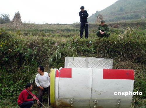 10月26日下午6時(shí),長征三號(hào)甲運(yùn)載火箭殘骸外殼已拆卸完畢,有關(guān)部門在組織交通車輛和人員裝載回收。10月24日18時(shí)05分,我國在西昌衛(wèi)星發(fā)射中心用長征三號(hào)甲運(yùn)載火箭將嫦娥一號(hào)成功送入太空。18時(shí)16分火箭殘骸安全按計(jì)劃墜落在貴州預(yù)定范圍。殘骸落于一民房,殘骸外殼落于玉米地,無人員受傷。中新社發(fā) 易勝武 攝