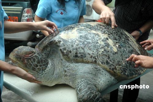 2007年11月1日,海南省小動物保護協(xié)會在?谑袞|海岸海邊救助一只約1米多長、重150公斤左右的國家二級野生保護動物綠海龜,移交給海洋漁業(yè)部門處理。該只罕見的綠海龜由附近居民發(fā)現(xiàn)后并自發(fā)呵護,但救助時已經(jīng)死亡。海南省漁業(yè)監(jiān)察總隊有關(guān)負責人稱,初步估計它至少有100歲以上,身上有多處傷痕,需要解剖才能查明真正死因,有關(guān)方面將把它制作成標本展覽,以教育人們保護海龜。中新社發(fā) 善平 攝