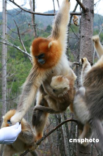 圖為11月1日,拍攝于湖北省神農(nóng)架大龍?zhí)吨信c人和諧相處的金絲猴。據(jù)了解,在金絲猴的食譜中,植物種類多達172種。為讓金絲猴安度寒冬,科研人員嘗試著讓金絲猴接受別的食物。經(jīng)過5個月的磨合,蘋果成了神農(nóng)架金絲猴的美食。神農(nóng)架給川金絲猴人工補食實驗的成功,既是對川金絲猴進行保護的寶貴經(jīng)驗,也是中國珍稀野生動物保護與研究的一個重大突破。
