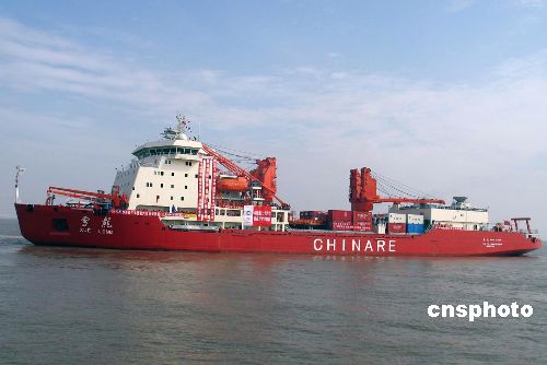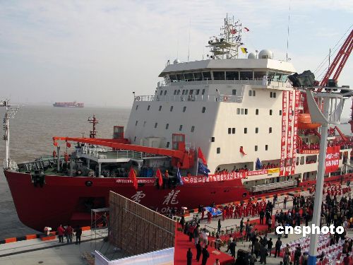 十一月十二日上午十時三十分,首次投入使用的外高橋的中國極地科考船專用碼頭上,彩旗迎風(fēng)招展。已舊貌換新顏的中國唯一從事極地破冰航行的科考船“雪龍”號身披紅裝從這里啟航奔赴南極,執(zhí)行第二十四次南極科考任務(wù)。中新社發(fā) 陸從兵 攝