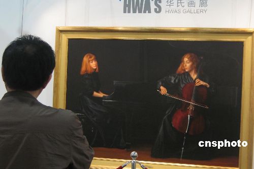全亞洲最大規(guī)模的藝術(shù)品展示交易平臺(tái)——二○○七(第十一屆)上海藝術(shù)博覽會(huì)十一月十五日起在上海世貿(mào)商城舉行,眾多海內(nèi)外實(shí)力畫廊或機(jī)構(gòu)均攜其得意之作前來參展。圖為由上海華氏畫廊參展的已故大師陳逸飛油畫代表作《二重奏》,這是陳逸飛音樂題材肖像畫中尺寸最大的一幅,也是他當(dāng)年轟動(dòng)美國藝術(shù)界的重量級(jí)油畫作品。中新社發(fā) 孫璐 攝