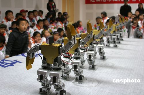 11月15日,人形機(jī)器人正在表演《千手觀音》節(jié)目。當(dāng)天,人形機(jī)器人表演科技觀摩活動(dòng)在江蘇連云港婦女兒童活動(dòng)中心舉行,15個(gè)人形機(jī)器人表演了《千手觀音》、小品《賣拐》、體操等節(jié)目。由中科大花費(fèi)兩年時(shí)間研制成功的人形機(jī)器人,身體具有17個(gè)自由度的調(diào)節(jié)功能,可做俯臥站立、跳舞、擁抱、做操等二十多個(gè)動(dòng)作,代表了中國(guó)表演類機(jī)器人的最高水平。中新社發(fā) 穆道勇 攝