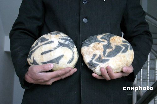 十一月十九日,河南伊川一奇石愛(ài)好者展示其收藏的兩塊有“龍”、“鶴”圖案的奇特石頭。據(jù)介紹,這位奇石愛(ài)好者最近在伊河灘撿到兩塊奇特的石頭,兩塊石頭均呈青灰色,大小相近,高約三十厘米、寬約二十厘米、厚約五厘米。一塊正面圖形酷似蛟龍,背面像北京奧運(yùn)會(huì)舞動(dòng)的“京”字會(huì)徽;另一塊正面圖案如同兩只嬉戲的仙鶴,背面則顯現(xiàn)出一副抽象的山水圖。兩塊奇石上的圖案惟妙惟肖、形象逼真。經(jīng)地質(zhì)專(zhuān)家徐海龍鑒定,確認(rèn)這兩塊奇石是天然的。中新社發(fā) 朱曉娟 攝