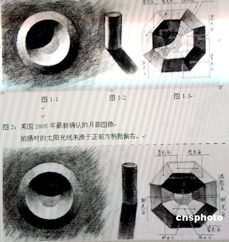 | 2007年12月6日,海南在京的一位畫家從光學角度找到中美兩“月亮”鮮明差別。中國嫦娥首幅月球圖像抄襲美國的傳言,在網(wǎng)上一度鬧得沸沸揚揚,海南省畫家、超常創(chuàng)意專家于廣勝在北京,反復對照中美兩圖琢磨研究,從光學角度發(fā)現(xiàn)兩幅圖象有著“更加鮮明的差別”,6日早晨他發(fā)現(xiàn)兩幅圖像是在不同的光源下拍攝的,從另一側(cè)面有力證明了我國嫦娥傳回圖像的真實性。于廣勝說,這一證據(jù)是普通大眾不易發(fā)現(xiàn)的,但通過他所手繪的幾幅圖,即可讓普通大眾一目了然。同時,凡是對光學有所研究或通曉繪畫用光、攝影和攝像用光的人們,自然明白其理。為了便于廣大讀者理解,他把地球上的環(huán)形山簡化為內(nèi)凹外凸的圓臺(圖1-1、2-1),以顯現(xiàn)不同光線來源下的不同光影效果;由此,又進一步簡化為內(nèi)凹外凸八棱臺(圖1-3、2-3)并標注了光線的來源和受光、測光、背光區(qū)域;同時,又畫了一個圓柱體(1-2、2-2)以顯現(xiàn)不同光照角度下的不同投影方向。通過兩組手繪圖,中國與美國公布的兩張圖像在拍攝時,太陽光照射月球角度明顯不同,至少左右相差42度左右。中國拍攝時的太陽光線來源于左前方,而美國拍攝時的太陽光線來源于正前方稍微偏右。于廣勝說,稍有電腦平面制作、攝影和攝像后期制作知識的人們都明白,圖片與圖片的任意組合拼接是輕而易舉的,但要想把圖片中各個圖像所有細節(jié)的光影全部改變是不可能的,“由此可見,我國嫦娥傳回的圖像其真實性是不容質(zhì)疑了!毕嚓P鏈接:12月2日,中國探月工程首席科學家、中國科學院院士歐陽自遠做客上!拔膮R講堂”,對關于“嫦娥首幅月球圖像抄襲美國”的傳言作出澄清:“嫦娥傳回的圖像確實是真實的,是經(jīng)過非常復雜的拍攝、傳輸、接收、處理過程后得到的,并且與美國所拍的圖像有細微差別”。我國嫦娥一號衛(wèi)星所攝的月面圖像上,某個地方有兩個小坑,而美國2005年最新確認的月面圖像上,同樣的地方只有一個小坑。中新社發(fā) 善平 攝
