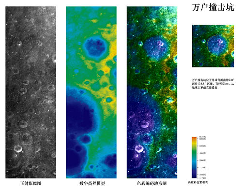 中國(guó)國(guó)家航天局今天向媒體發(fā)布信息說,“嫦娥一號(hào)”衛(wèi)星CCD相機(jī)已對(duì)月球背面進(jìn)行成像探測(cè),并獲取了月球背面部分區(qū)域的影像圖。此圖顯示的是萬戶撞擊坑。萬戶撞擊坑位于月球背面南緯9.8度西經(jīng)138.8度區(qū)域,直徑52km,從地球上不能直接看到。