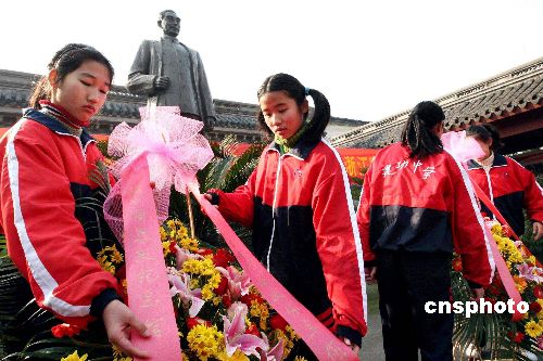 浙江紹興的中學(xué)生們向周恩來(lái)塑像獻(xiàn)花籃。