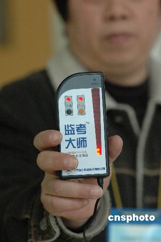 1月19日下午,江蘇常州考點(diǎn)內(nèi)工作人員用“監(jiān)考大師”工具對(duì)考生手機(jī)信息進(jìn)行監(jiān)測(cè)。2008年1月19、20日兩天,是全國(guó)研究生入學(xué)統(tǒng)一考試的日子。江蘇全省各考點(diǎn)啟用了先進(jìn)的無線監(jiān)測(cè)裝置,嚴(yán)防考生作弊。中新社發(fā) 楊素平 攝