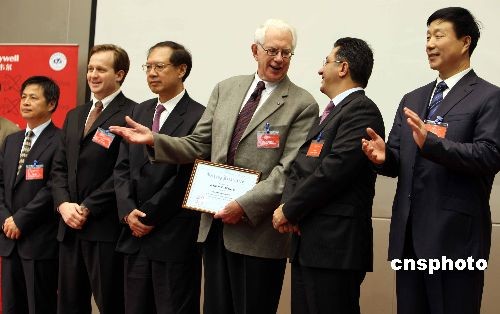 四月九日,全球500強(qiáng)、世界領(lǐng)先的多元化高科技制造企業(yè)霍尼韋爾公司攜手北京航空航天大學(xué),共同拉開2008年霍尼韋爾—諾貝爾全球校園行的序幕。諾貝爾物理獎獲得者謝爾登·格拉肖博士(右三)親臨現(xiàn)場為學(xué)子們講授了他的學(xué)術(shù)成果和科研心得,與學(xué)生們進(jìn)行了面對面的交流;裟犴f爾—諾貝爾全球校園行活動由霍尼韋爾公司發(fā)起,旨在全球范圍內(nèi)提升高?茖W(xué)教育、培養(yǎng)高素質(zhì)科技創(chuàng)新人才的社會公益活動。中新社發(fā) 任海霞 攝