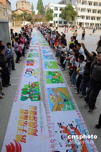 2008年4月17日下午,湖北省南漳縣實(shí)驗(yàn)小學(xué)舉辦了“攜手繪福娃,同心迎奧運(yùn)”百米畫卷啟動(dòng)儀式。全校學(xué)生將一幅幅福娃淋漓盡致地描繪在百米長卷上,用實(shí)際行動(dòng)迎接今年8月的北京奧運(yùn)會(huì)到來。作者: 熊明銀
