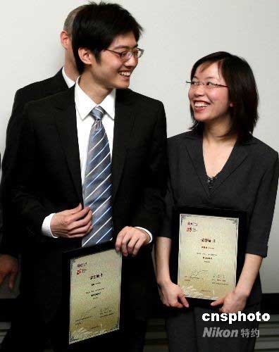 5月7日,清華大學(xué)“清華-杜孟傳播獎學(xué)金”頒獎典禮上,獲得此項(xiàng)獎勵“最佳創(chuàng)意獎”的清華學(xué)生侯青楊(右)、“優(yōu)秀策劃案獎”得主張棟同學(xué),分別獲得赴瑞士日內(nèi)瓦和泰國曼谷的聯(lián)合國愛滋病規(guī)劃署實(shí)習(xí)3個月的機(jī)會。這兩位清華學(xué)生將與世界各地專業(yè)人士一起為解決世界和中國可能發(fā)生的由愛滋病引起的嚴(yán)重健康危機(jī)而工作。中新社發(fā) 宋吉河 攝