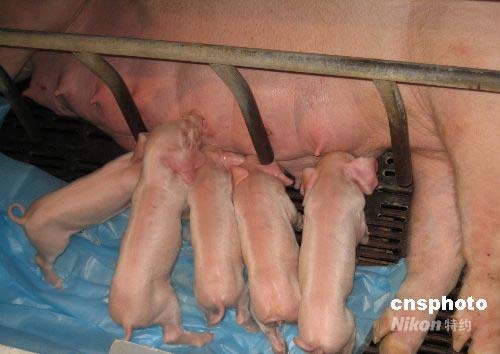 五月十七日上午,廣東省首例體細(xì)胞五頭克隆豬,在云浮新興縣廣東溫氏食品集團(tuán)有限公司水臺原種豬場集體亮相。十五日下午克隆豬誕生,其中最重的一只克隆豬為一點(diǎn)九公斤,一胎產(chǎn)下五頭存活“克隆豬” 為國內(nèi)之最。該“克隆豬”是溫氏集團(tuán)與中國農(nóng)業(yè)大學(xué)、華南農(nóng)業(yè)大學(xué)合作的成果,填補(bǔ)了該省在該領(lǐng)域的空白,也是繼北京、黑龍江、上海、廣西等地之后,在中國大陸第五個(gè)擁有體細(xì)胞克隆豬的省份,是國內(nèi)率先開展體細(xì)胞克隆豬研究的企業(yè)。中新社發(fā) 黃耀輝 攝