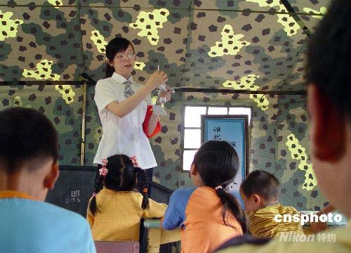 大學生志愿者在災區(qū)救助中心為孩子上課