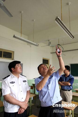 六月六日,2008年中國高考的最后準備階段。從當日下午起,北京各個高考點將進行教室安全檢查、貼封條的最后階段,北京警方也投入力量對教室進行最后的安全檢查,排除隱患,確保高考順利進行。中新社發(fā) 任海霞 攝