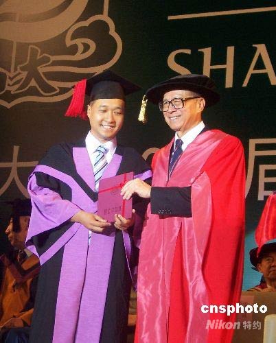 六月二十六日,廣東汕頭大學(xué)舉行二00八屆畢業(yè)典禮。圖為校董會(huì)名譽(yù)主席李嘉誠(chéng)為該校博士生頒發(fā)學(xué)位證書。中新社發(fā) 李怡青 攝