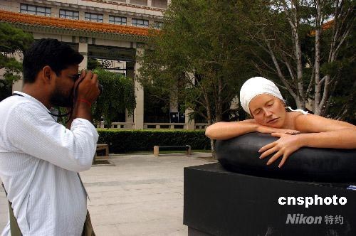 7月8日,“2008·第三屆中國北京國際美術(shù)雙年展”在北京美術(shù)館舉行,吸引不少外國游客到來。此次展覽有來自81個國家的747件當(dāng)代繪畫和雕塑作品共同展出,展覽將持續(xù)到8月12日。圖為展廳外的參展“模特”栩栩如生,讓人難辨真假。中新社發(fā) 張雙雙 攝