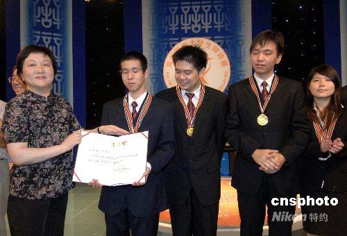 7月23日,中國科學(xué)技術(shù)協(xié)會(huì)書記處書記程?hào)|紅女士為榮獲第七屆海峽兩岸大學(xué)生辯論賽團(tuán)體冠軍的來自臺(tái)灣的東吳大學(xué)代表隊(duì)頒獎(jiǎng)。當(dāng)日,歷時(shí)3天的第七屆海峽兩岸大學(xué)生辯論賽在福州圓滿落幕。中新社發(fā) 劉可耕 攝