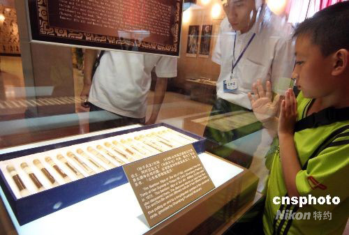 7月23日,北京中國軍事博物館舉行的“制勝之道——《孫子兵法》”展上,20片刻有《孫子兵法》的竹簡以特殊形態(tài)亮相。為保護這些竹簡,每片竹簡都保存在一個裝滿藥水的密閉管中。據介紹,這些竹簡是從3個不同墓坑中發(fā)掘的。中新社發(fā) 吳芒子 攝