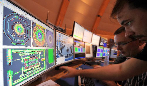 歐洲核子研究中心的科學(xué)家在瑞士日內(nèi)瓦附近的大型強(qiáng)子對撞機(jī)控制中心忙碌。