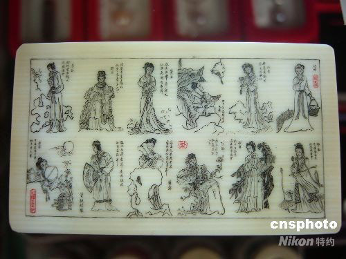 9月21日,象牙微雕《金陵十二釵》作品亮相蘇州。當日,蘇州民間藝人郭克杰耗時近一個月創(chuàng)作完成的象牙微雕《金陵十二釵》作品展示在人們面前,十二位人物造型栩栩如生。該微雕作品長4.8厘米,寬2.5厘米。中新社發(fā) 李俊鋒 攝
