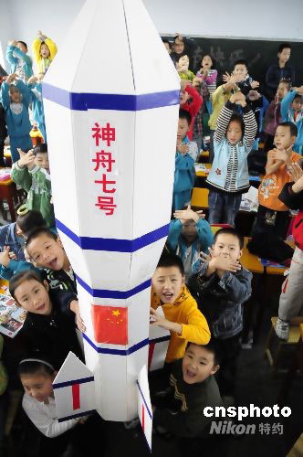 9月25日,河南省南陽市第四小學(xué)三(1)班的學(xué)生們制作了一只“神舟七號”,預(yù)祝我國的“神七”發(fā)射計劃圓滿成功。中新社發(fā) 付海厚 攝