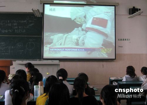 2008年9月27日下午,安徽師范大學(xué)學(xué)生在教室集體觀看宇航員太空行走直播。北京時間9月27日下午四點(diǎn)五十九分,神舟七號航天員翟志剛成功出艙,實(shí)現(xiàn)中國歷史上第一次太空行走。中新社發(fā) 劉淮宇 攝