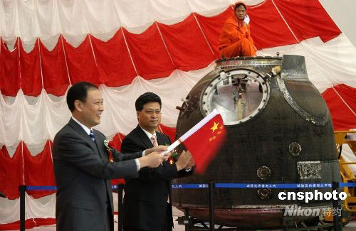10月1日上午,神舟七號載人飛船返回艙在其誕生地——中國航天科技集團(tuán)公司所屬中國空間技術(shù)研究院舉行開艙暨搭載物交接儀式,伴隨三位中國航天員太空飛行六十八小時二十七分鐘的一批特殊“乘客”一一精彩亮相,隨后各歸其主。中新社發(fā) 孫自法 攝