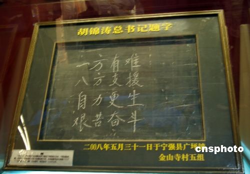 10月9日,在北京軍博舉辦的“萬眾一心 眾志成城”抗震救災主題展上展出了胡錦濤總書記在陜西省漢中市寧強縣金山寺村察看災情、檢查指導抗震救災工作和慰問災區(qū)的孩子們時,在一間用帳篷搭建的臨時教室里,在小黑板上寫下的“一方有難 八方支援 自力更生 艱苦奮斗”的題詞。中新社發(fā) 九州 攝