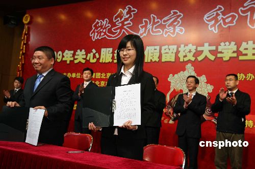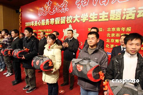 一月十日,北京啟動(dòng)“微笑北京 和諧社會(huì)”關(guān)心服務(wù)寒假留校大學(xué)生主題活動(dòng),其主要內(nèi)容包括關(guān)心地震災(zāi)區(qū)、邊遠(yuǎn)地區(qū)和經(jīng)濟(jì)困難大學(xué)生,提供見習(xí)崗位,幫助同學(xué)們利用寒假進(jìn)行就業(yè)創(chuàng)業(yè)見習(xí)。為留校學(xué)生贈(zèng)送兩千個(gè)愛心大禮包。中新社發(fā) 任海霞 攝