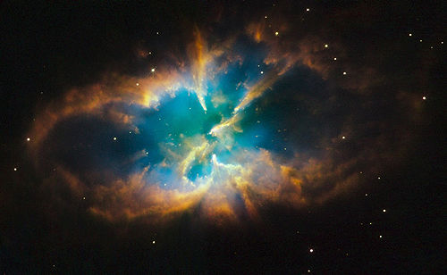 據(jù)美國每日太空網(wǎng)報道,哈勃太空望遠(yuǎn)鏡日前拍攝到銀河系內(nèi)一個罕見的美麗行星狀星云NGC2818,它隱藏在一個距離地球1萬光年羅盤星座的恒星團(tuán)內(nèi)部。這張精美的圖片是由哈勃太空望遠(yuǎn)鏡廣角行星2號相機(jī)于2008年11月份拍攝的,其彩色部分分別代表著該星云的噴射釋放物質(zhì),它們共同組成細(xì)絲狀漩渦結(jié)構(gòu),其中紅色部分代表氮氣、綠色部分代表氫氣、藍(lán)色部分代表氧氣。