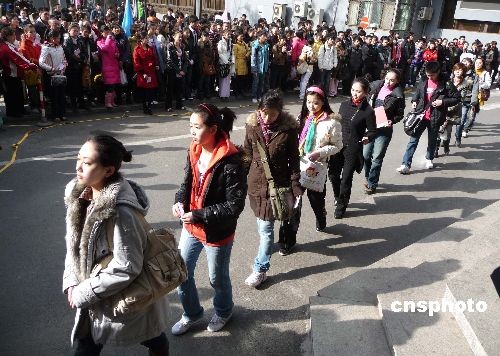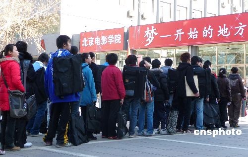 2009年2月7日,北京電影學(xué)院2009年招生初試工作已進(jìn)入了第三天,一批批來自全國各地的考生繼續(xù)為圓明星夢而拼搏努力。今年最顯著的特點(diǎn)是本色考生越來越多,濃妝艷抹、奇裝異服的考生少了。據(jù)悉,表演專業(yè)一直被認(rèn)為是北影“最難考的專業(yè)”,雖然今年的招生人數(shù)由往年的30人增加到75人,但面對4234名報(bào)考者,淘汰率仍高達(dá)98.2%。一位考官告訴記者,雖然報(bào)名者很多,但有充分準(zhǔn)備、專業(yè)水平較高的考生不超過千人,還是有很多考生很盲目。中新社發(fā) 玉龍 攝