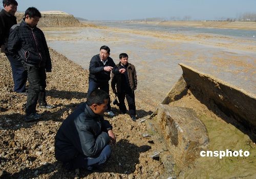2009年3月25日,在京杭運(yùn)河山東臺兒莊段拍攝到的浮出水面的明朝古運(yùn)河船閘閘址。近日,一座在水下沉睡了400多年的古水工建筑遺址(古船閘)在京杭運(yùn)河臺兒莊段進(jìn)行河道疏浚工程時被發(fā)現(xiàn),這座古船閘位于新閘村北古運(yùn)河中心,船閘東西長約56米,南北約12米,古船閘的木樁繁多,條狀塊石可見,閘門樁基遺址清晰,據(jù)考證船閘修建于明朝萬歷年間,是明代泇運(yùn)河上的丁廟船閘,是棗莊段運(yùn)河(泇運(yùn)河)的八閘之一,距今400多年。此次古船閘的發(fā)現(xiàn),是繼頓莊船閘后的又一重大發(fā)現(xiàn),對古運(yùn)河棗莊段歷史和古水工建筑的研究具有非常重要的價值。中新社發(fā) 高啟民 攝