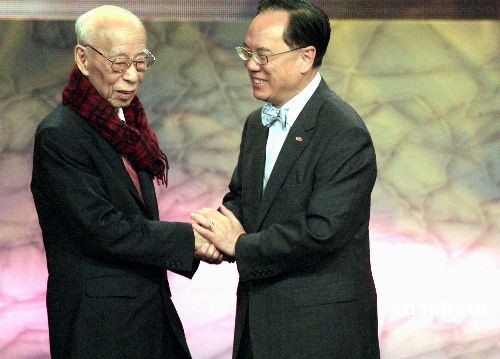 四月二十一日,香港特區(qū)行政長官曾蔭權(quán)為最高榮譽“終身成就獎”得主國學(xué)大師兼漢學(xué)家饒宗頤教授頒獎祝賀。當(dāng)日,“2008香港藝術(shù)發(fā)展獎”頒獎禮在香港大會堂舉行,頒發(fā)了三十一個獎項予本地藝術(shù)工作者、團體、學(xué)校及商業(yè)機構(gòu),以表揚他們在藝術(shù)方面的成就。中新社發(fā) 張勤 攝