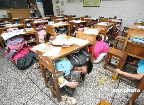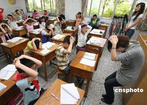 5月12日,重慶江北華新實(shí)驗(yàn)小學(xué)的孩子們在學(xué)習(xí)災(zāi)害發(fā)生時(shí)的緊急避難知識。當(dāng)日是首個(gè)“防災(zāi)減災(zāi)日”,重慶各學(xué)校紛紛進(jìn)行防災(zāi)避難課和災(zāi)害發(fā)生時(shí)的緊急避難及人員疏散演練,提高孩子們在災(zāi)害發(fā)生時(shí)的自我保護(hù)意識和掌握各種臨時(shí)避難方法。中新社發(fā) 賀終榮 攝