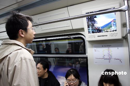 10月24日,北京市民在地鐵里通過(guò)移動(dòng)電視觀看“嫦娥一號(hào)”奔月實(shí)況。北京時(shí)間十八時(shí)零五分,中國(guó)在西昌衛(wèi)星發(fā)射中心用“長(zhǎng)征三號(hào)甲”運(yùn)載火箭將“嫦娥一號(hào)”衛(wèi)星成功送入太空。據(jù)悉,這次新聞?lì)l道將連續(xù)三天推出“嫦娥一號(hào)”特別節(jié)目,市民還可以通過(guò)中央國(guó)際網(wǎng)站和CCTV無(wú)線互聯(lián)網(wǎng)觀看奔月盛況。中新社發(fā) 鄭雄增 攝