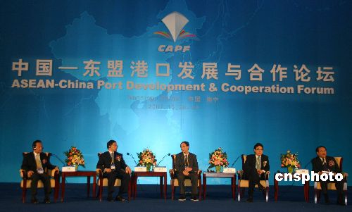十月二十九日,新加坡萬(wàn)邦集團(tuán)董事長(zhǎng)曹慰德、印尼BLT船務(wù)公司主席王景祺、泰國(guó)宏海箱運(yùn)有限公司高級(jí)副總裁彭猜、深圳鹽田港董事長(zhǎng)鄭京生以及中國(guó)海運(yùn)集團(tuán)公司副總裁張國(guó)華列席在廣西南寧舉行的“中國(guó)—東盟港口發(fā)展與合作論壇”,暢談港口合作。中新社發(fā) 王剛 攝
