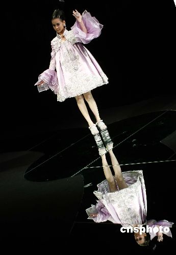 十一月三日晚,在北京舉行的2007年中國(guó)國(guó)際時(shí)裝周的舞臺(tái)上,模特在夢(mèng)幻般的舞臺(tái)上展示設(shè)計(jì)師華麗的作品。中新社發(fā) 盛佳鵬 攝