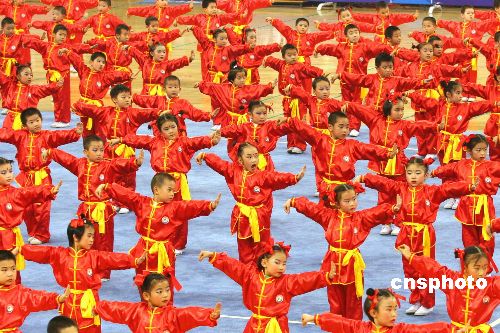 圖為在開幕式上,由百余名兒童組成的表演隊(duì)為在場觀眾奉獻(xiàn)精彩的表演。