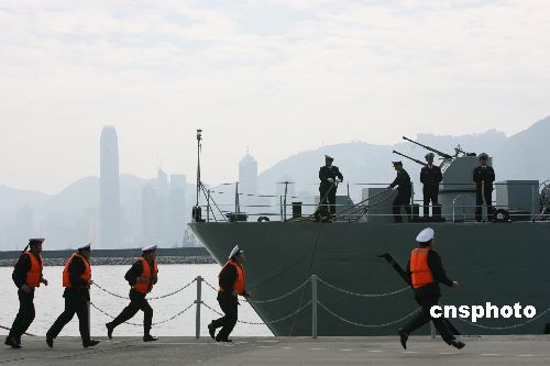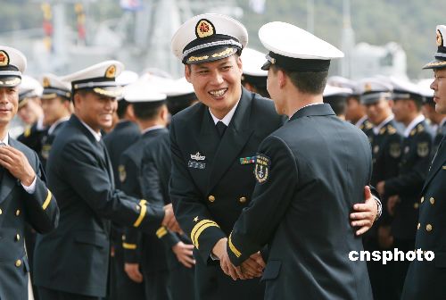 圖為輪換出港和進(jìn)港的海軍官兵親切問候。